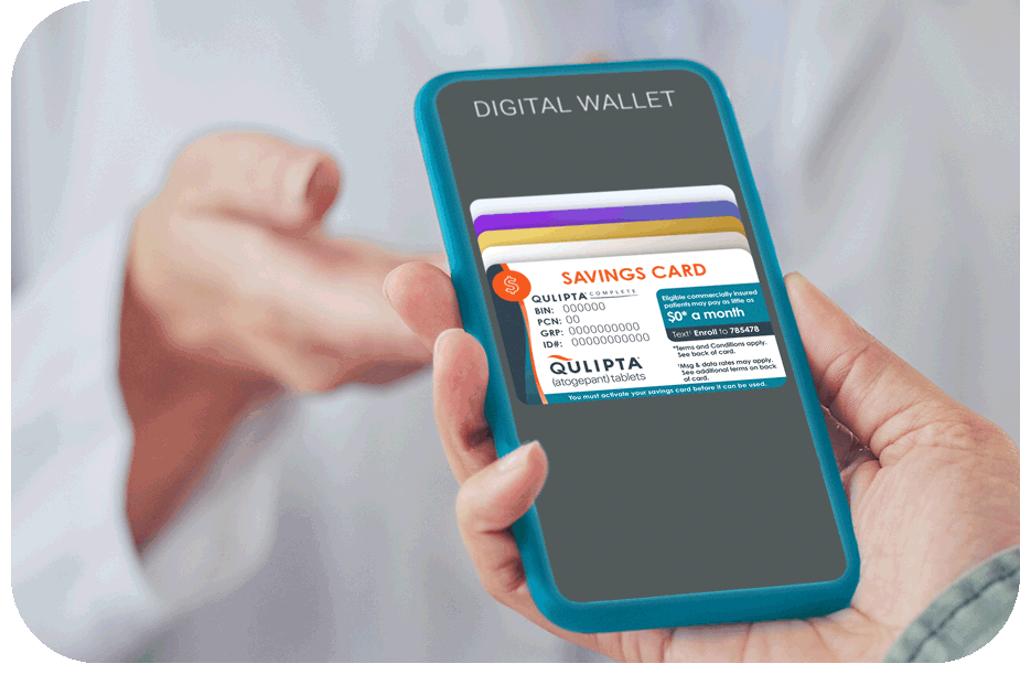 *Terms and Conditions apply. This benefit covers QULIPTA. Eligibility: Available to patients with commercial prescription insurance coverage for QULIPTA who meet eligibility criteria. Copay assistance program is not available to patients receiving prescription reimbursement under any federal, state, or government-funded insurance programs (for example, Medicare [including Part D], Medicare Advantage, Medigap, Medicaid, TRICARE, Department of Defense, or Veterans Affairs programs) or where prohibited by law or by the patient’s health insurance provider. If at any time a patient begins receiving prescription drug coverage under any such federal, state, or government-funded healthcare program, patient will no longer be able to use the QULIPTA Patient Savings Program Card and patient must call QULIPTA at 1-800-QULIPTA and stop use of the copay card. Patients residing in or receiving treatment in certain states may not be eligible. Patients may not seek reimbursement for value received from QULIPTA Patient Savings Program, including the copay card, from any third-party payers. Offer subject to change or discontinuance without notice. Restrictions, including monthly maximums, may apply. This is not health insurance.